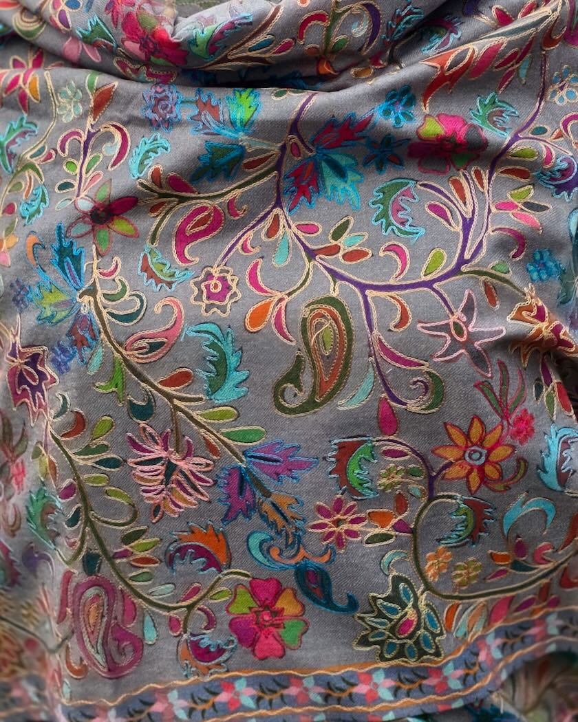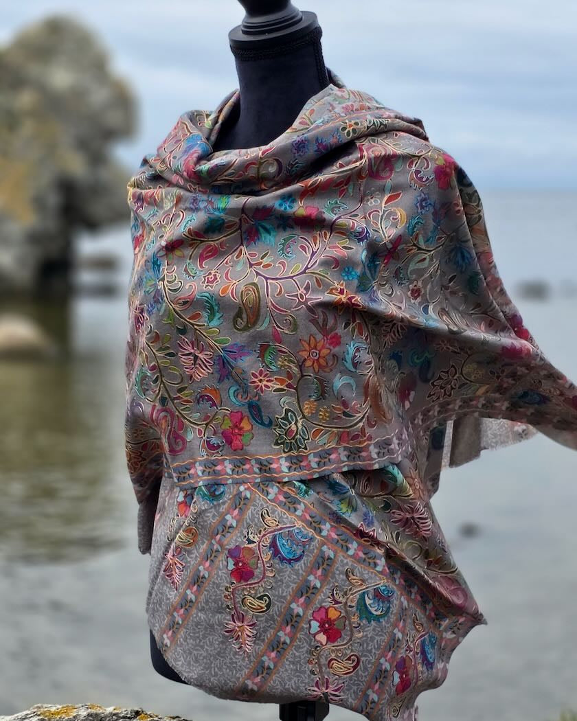 Exklusiv sjal i mjukaste merinoull med vackert tryckt blommönster som kantats med broderier.