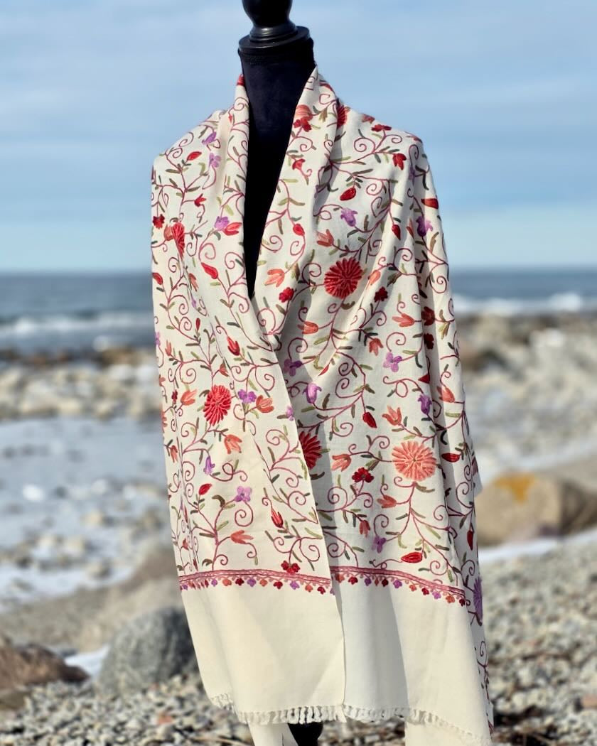 Ett fantastiskt vacker tradtionellt handbroderad värmande yllesjal i tambursöm, broderad  av skickliga brodörer  och brodöser i Kashmir. Ett konstverk som förgyller och värmer till vardags och fest. Passar lika bra en sval sommarkväll, som på kontoret, som till vårjackan, som till feststassen - valet är ditt!
