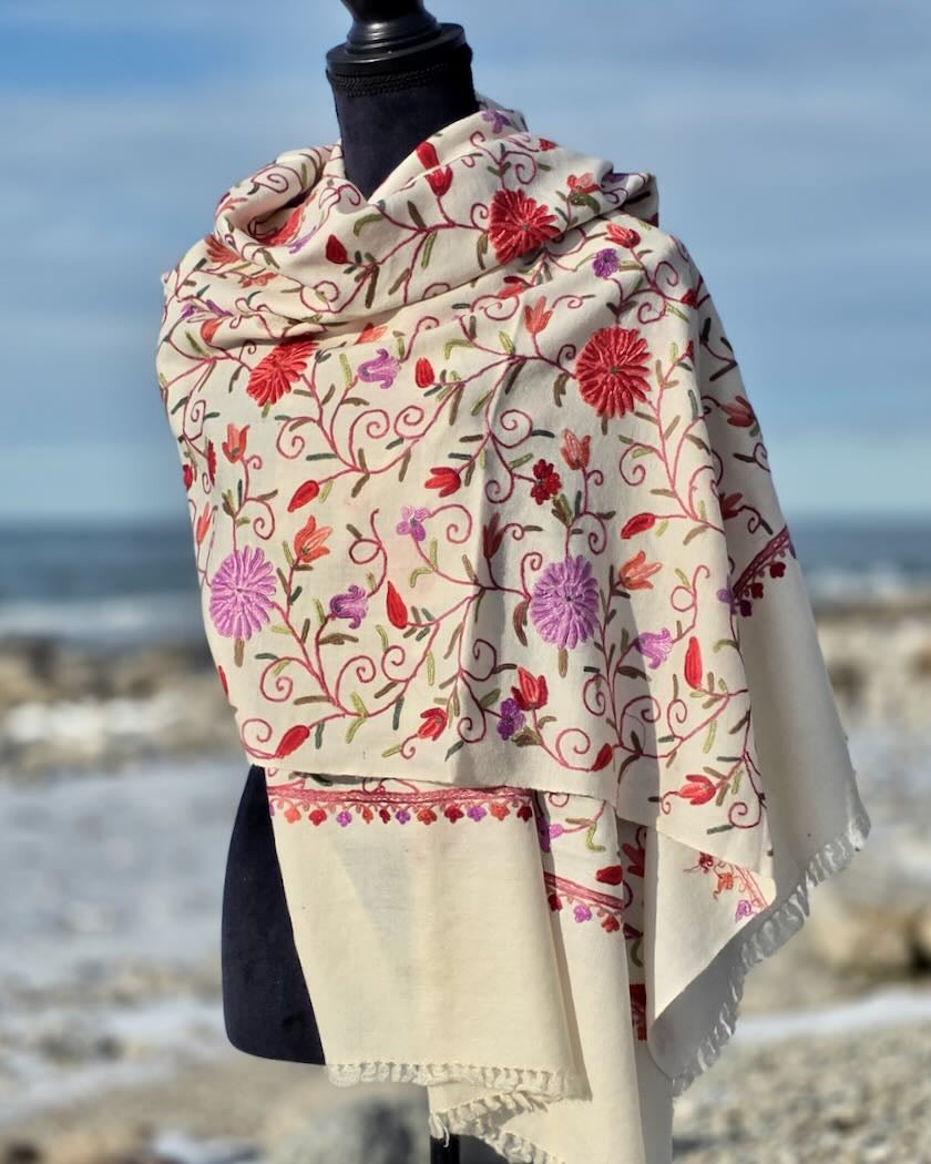 Handbroderad yllesjal blomranka på naturvit