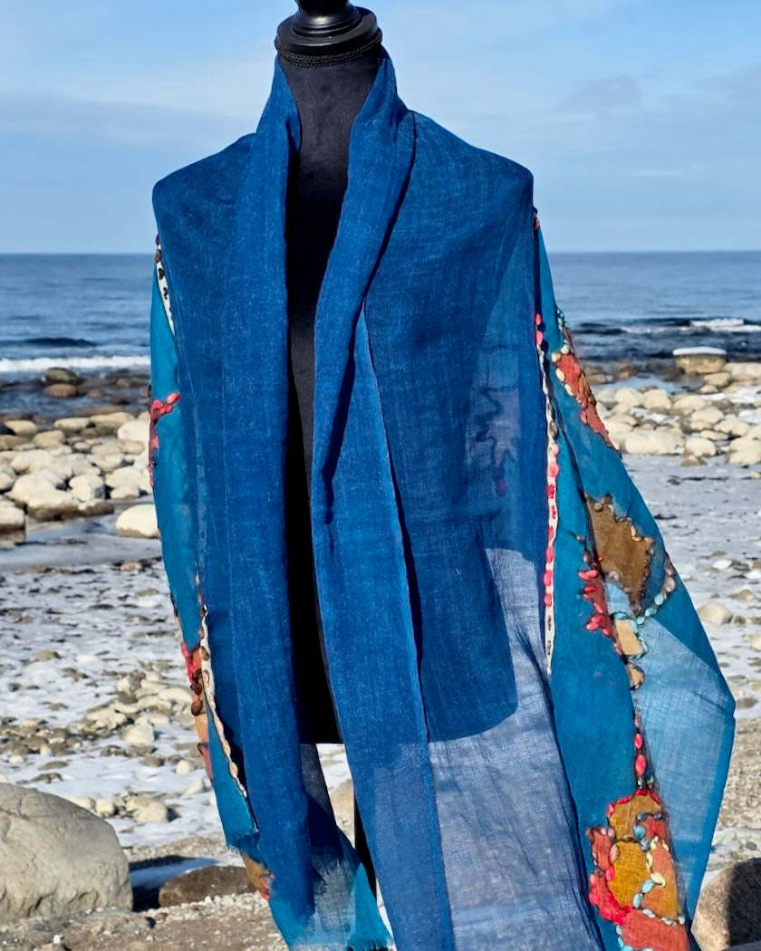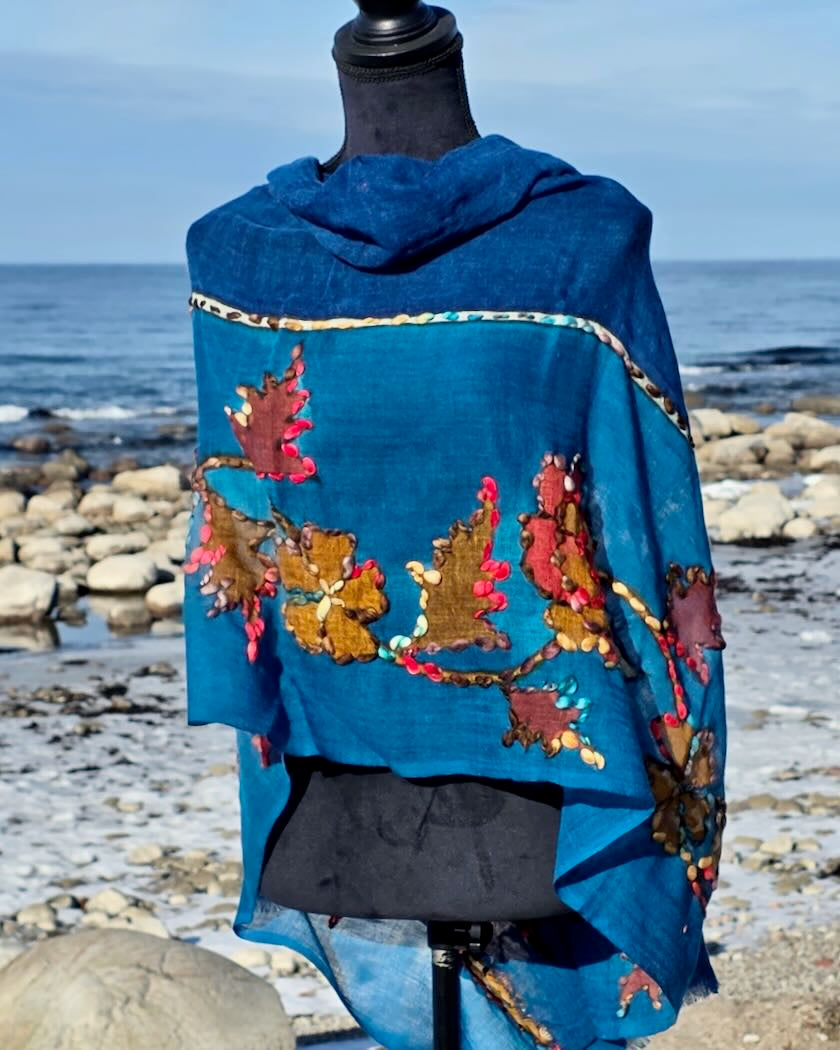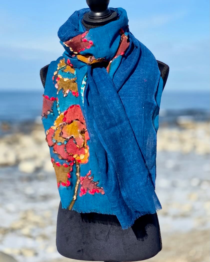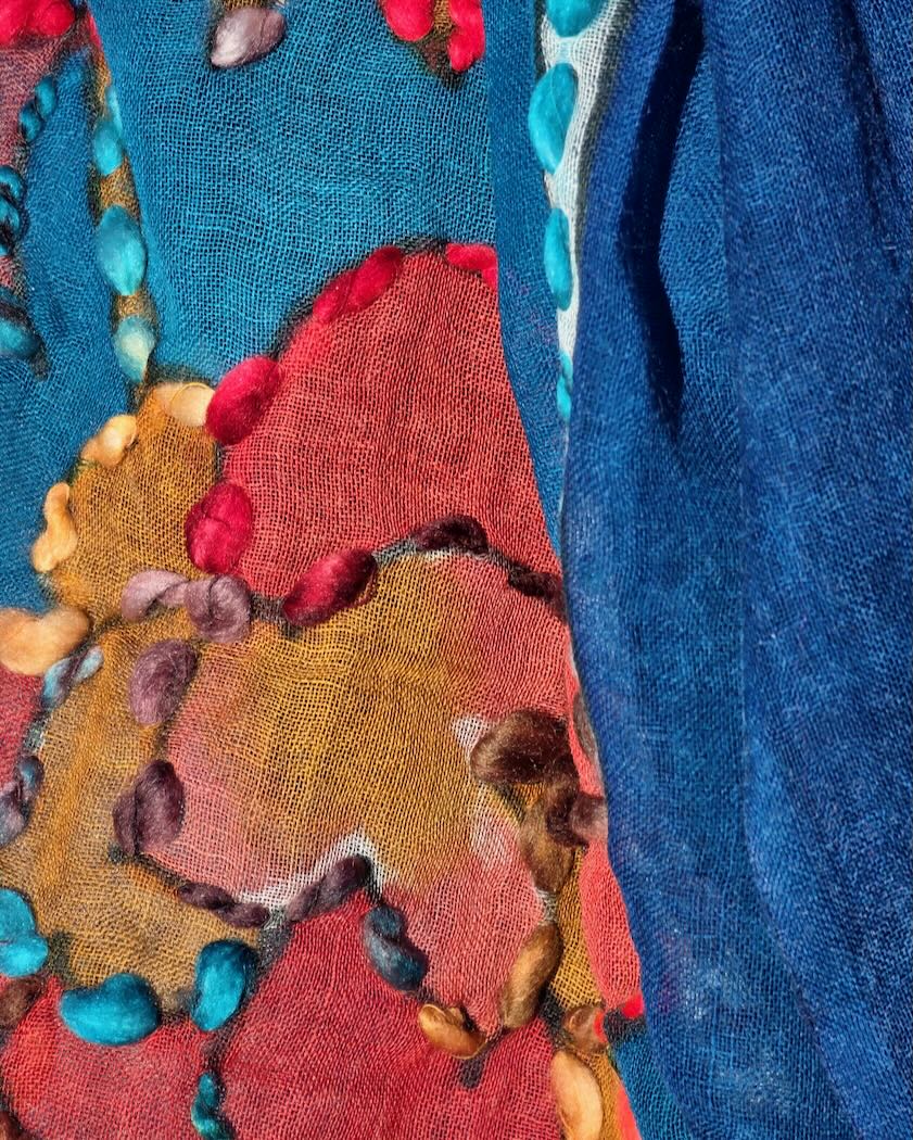 En bohoinspirerad luftig yllehalsduk med handmålade motiv och konturbrodyr. Varje halsduk är unik med egna uttryck. Passar lika bra en sval sommarkväll, som på kontoret, som till vårjackan- valet är ditt!