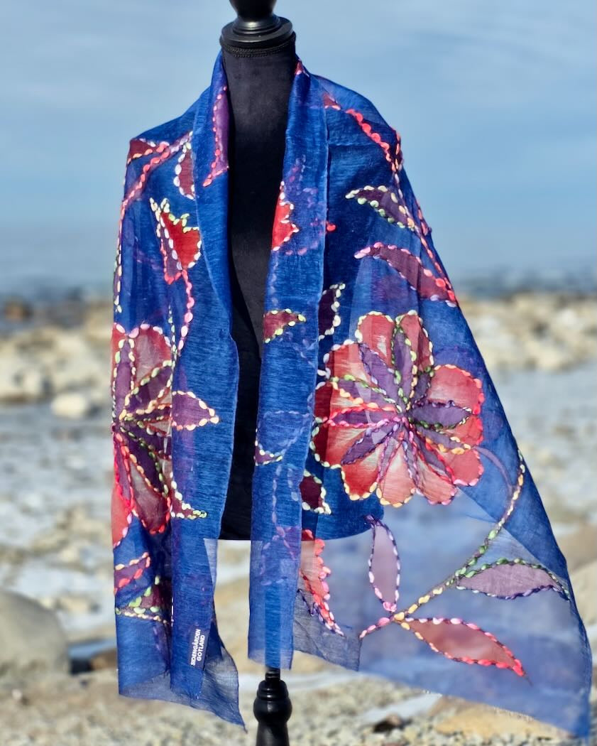 En bohoinspirerad halsduk i luftig ull- och silkeblandning med handmålade motiv och konturbrodyr. Varje halsduk är unik med egna uttryck. Passar lika bra en sval sommarkväll, som på kontoret, som till vårjackan- valet är ditt!