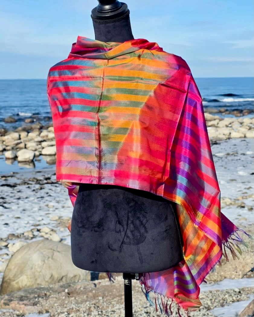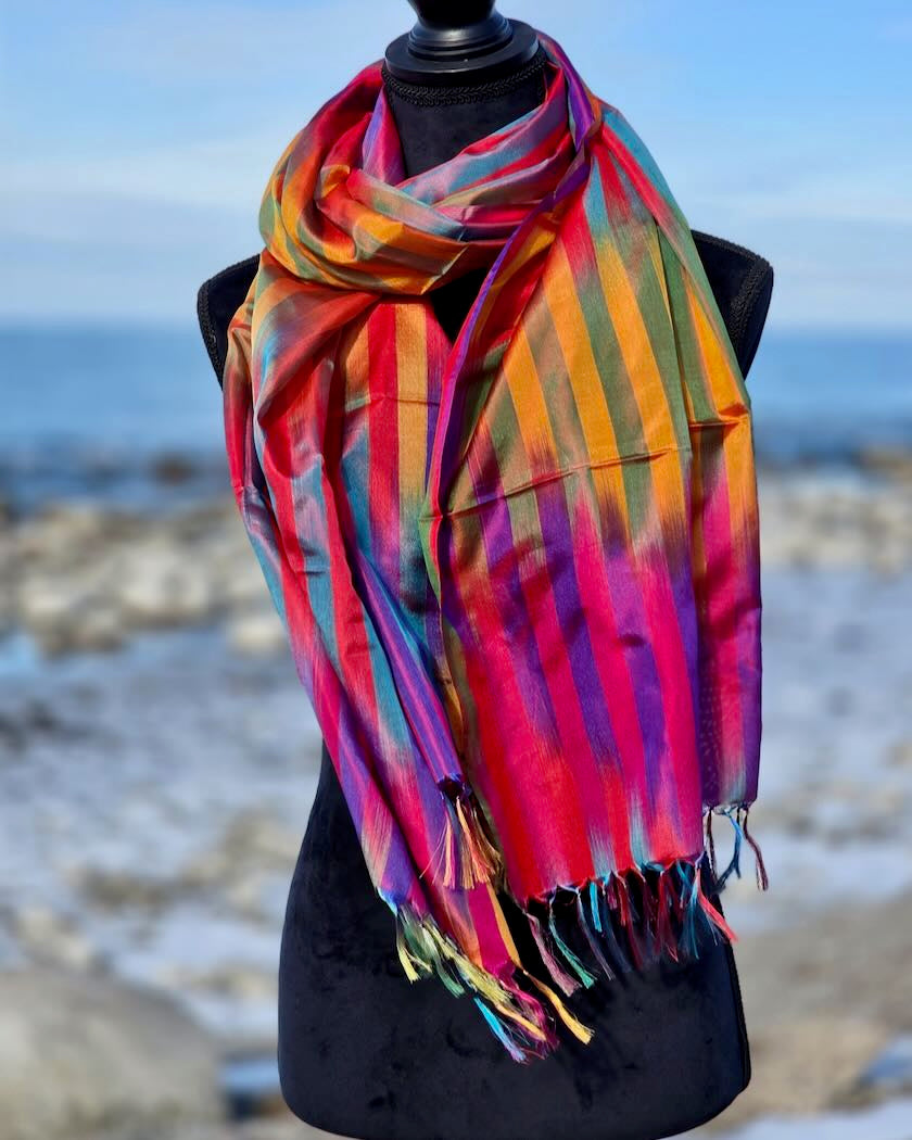 Denna handvävda sidensjal, vävd i ikat teknik, är en riktig färgklick som lyser upp och gör dig glad i alla väder och vid alla tillfällen året runt! Passar lika bra på kontoret som till feststassen - valet är ditt.