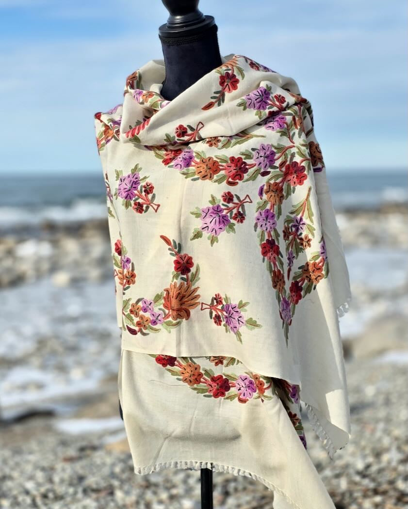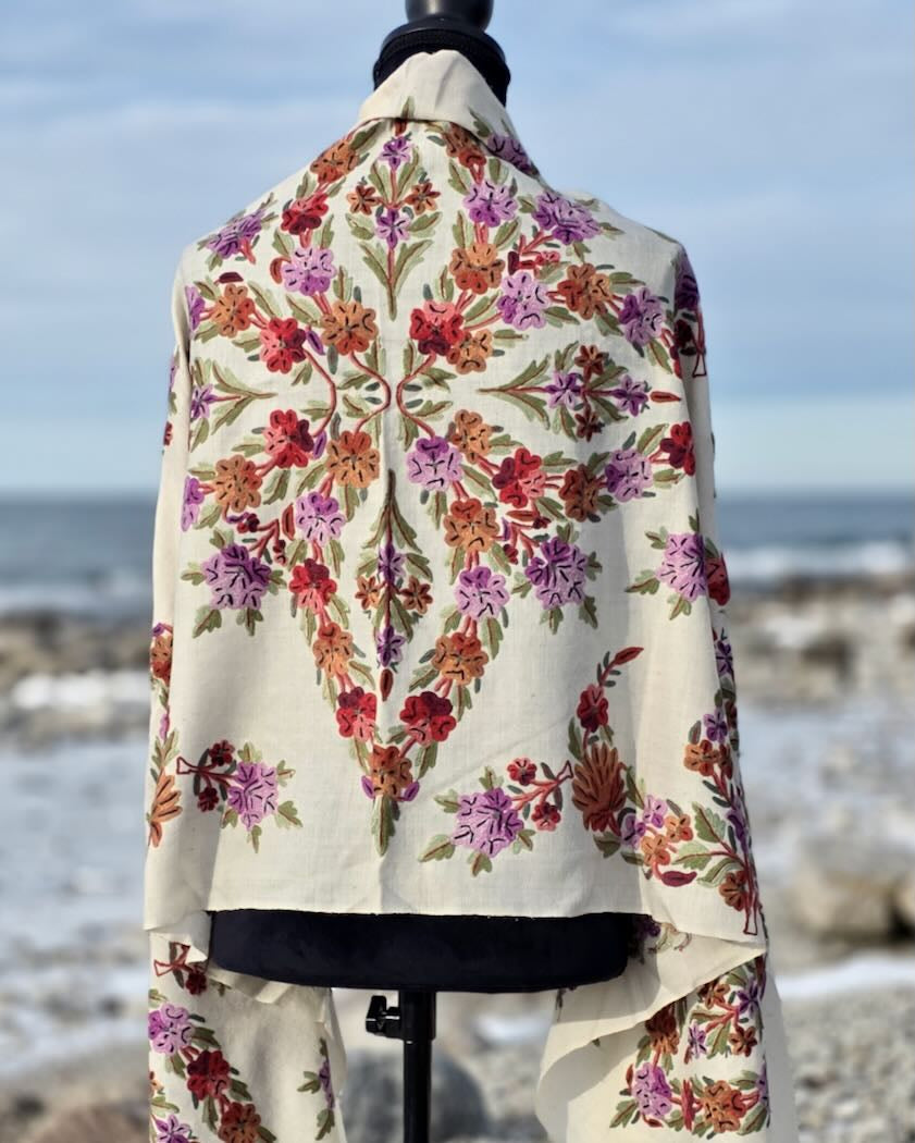 Ett fantastiskt vackert handbroderat konstverk i form av en elegant och värmande yllesjal! Denna fantastiska sjal är handbroderad med tambursöm av mästerbrodören Ali Mohammad i Kashmir. Vi träffade honom i Srinagar för drygt 12 år sedan och genom åren har vi köpt ett antal vackra yllesjalar som han har designat och broderat. Tyvärr gick han bort 2024, men vi har fått möjligheten att köpa in några av hans sista mästerverk, så passa på att förvärva ett av Alis tidlösa vackra mästerverk!