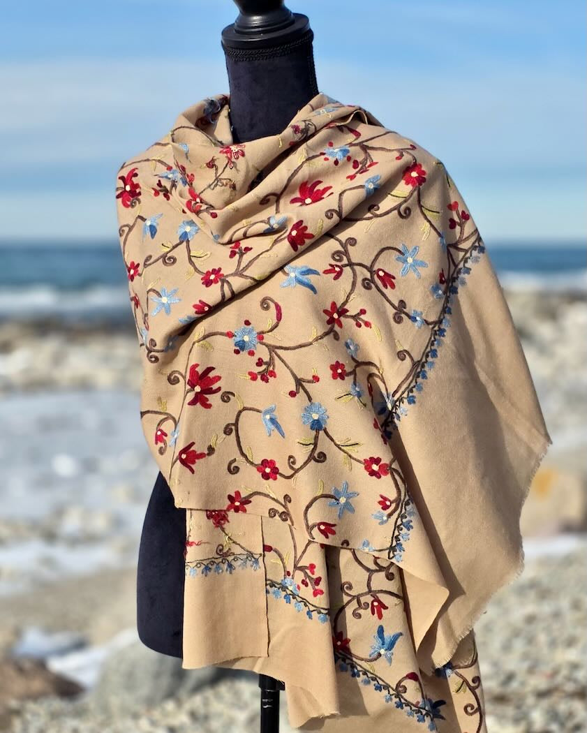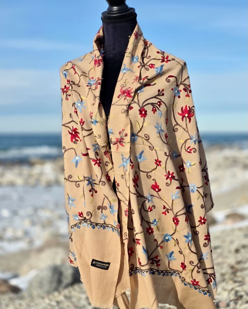 Ett fantastiskt vacker tradtionellt handbroderad värmande yllesjal i tambursöm, broderad av skickliga brodörer och brodöser i Kashmir. Ett konstverk som förgyller och värmer till vardags och fest. Passar lika bra en sval sommarkväll, som på kontoret, som till vårjackan, som till feststassen - valet är ditt!