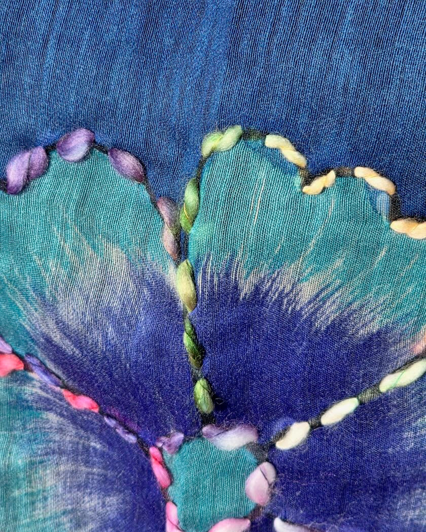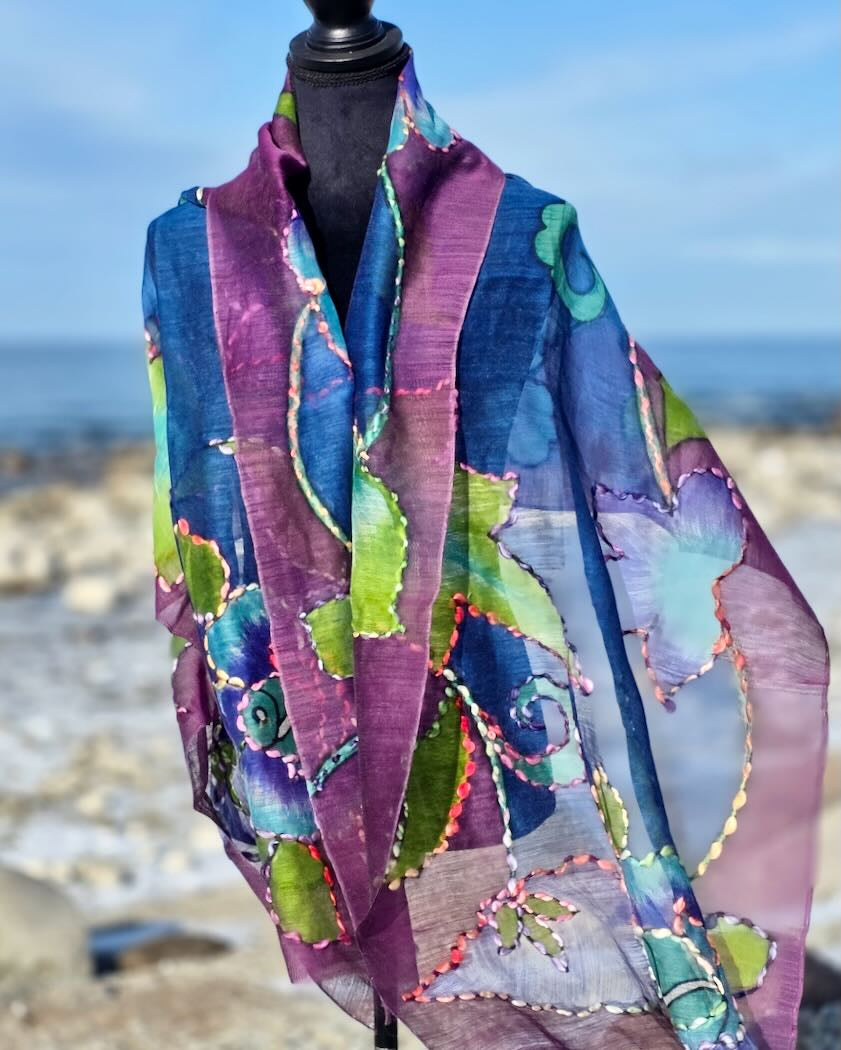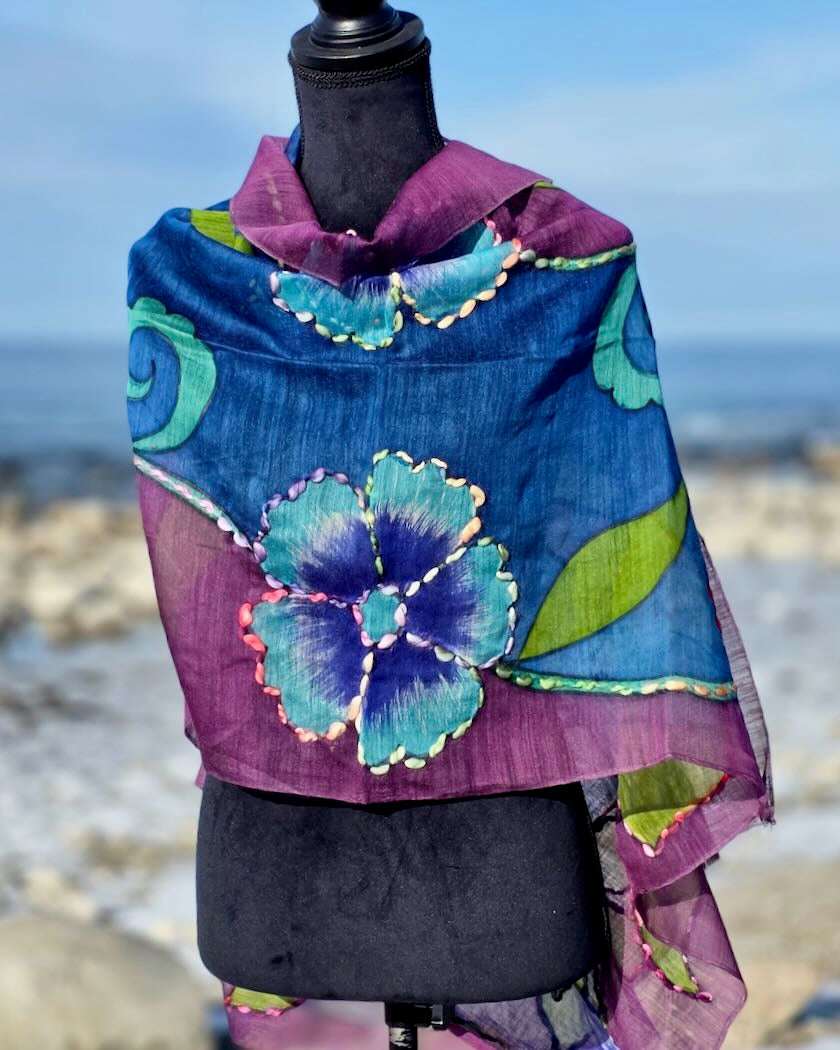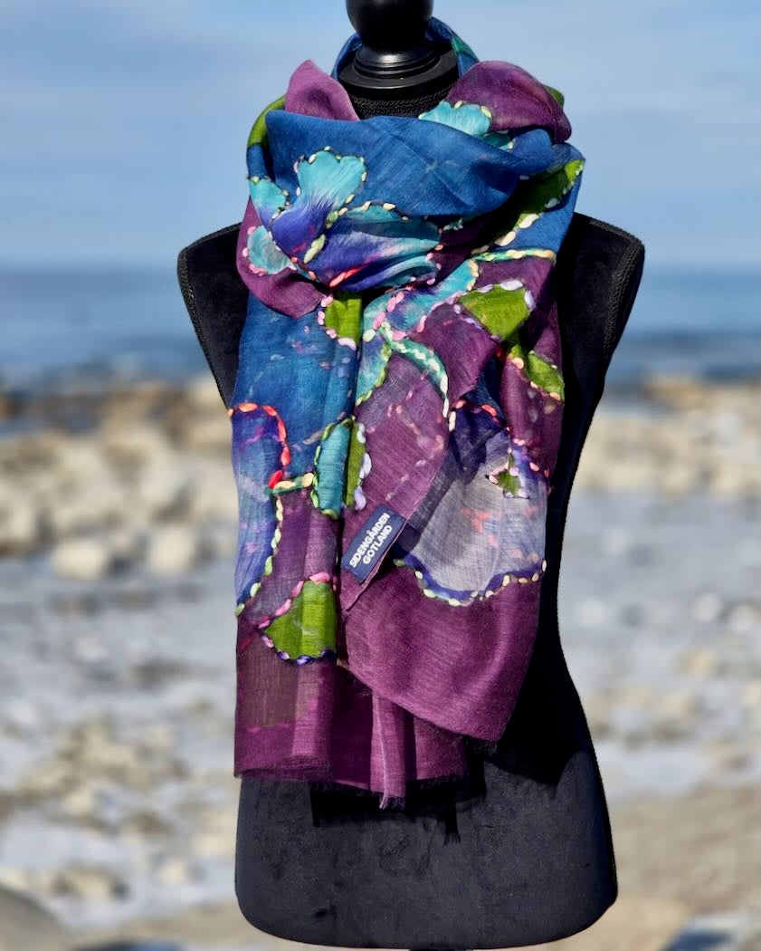 En bohoinspirerad halsduk  i luftig ull och silkeblandning med handmålade motiv och konturbrodyr. Varje halsduk är unik med egna uttryck. Passar lika bra en sval sommarkväll, som på kontoret, som till vårjackan- valet är ditt!