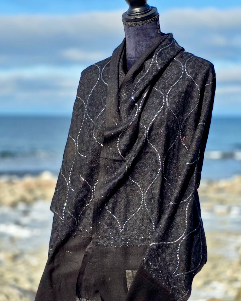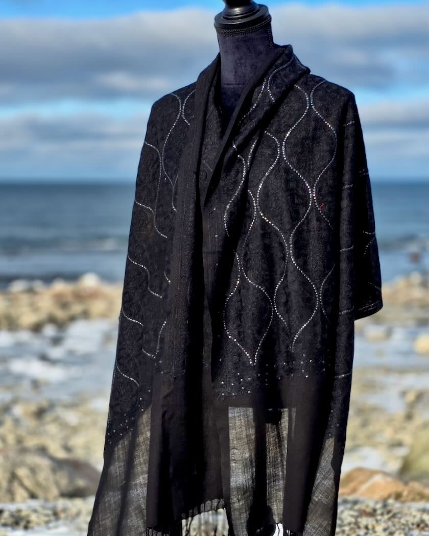 Beautiful elegant and soft shawl in the finest merino wool in high quality with beautiful embroidery in viscose that gives the shawl a little weight and a beautiful drape. A lovely shawl to wrap yourself in - light, warm and incredibly comfortable! Perfect for a party or whenever you want a little luxury in your life.